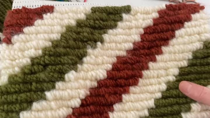 Каждый ряд смещайтесь разными цветами пряжи на одну петлю в сторону, чтобы получился красивый узор!