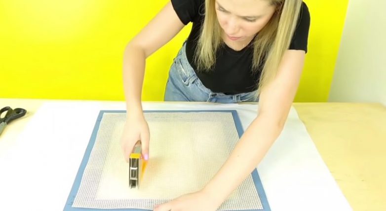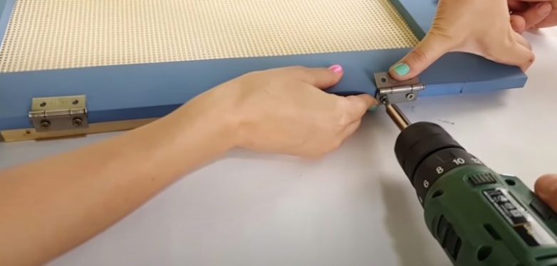 Покрасьте раму краской выбранного цвета в несколько слоев с промежуточным просыханием краски. Придать тумбе оригинальный внешний вид поможет использование канвы с большими ячейками. Вырежьте ткань по размерам дверцы и закрепите ее, используя промышленный степлер.
