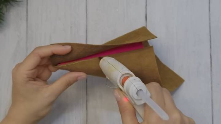 Вырежьте заготовку. Острый край срежьте. Сверните в конус, проклейте край горячим клеем. Оберните коричневым фетром, приклейте, обрежьте лишнее.