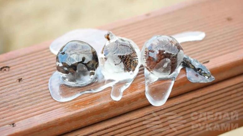 Подробно о том, как самому сделать оригинальные ледяные шарики из эпоксидной смолы, можно посмотреть в видеоролике на сайте.