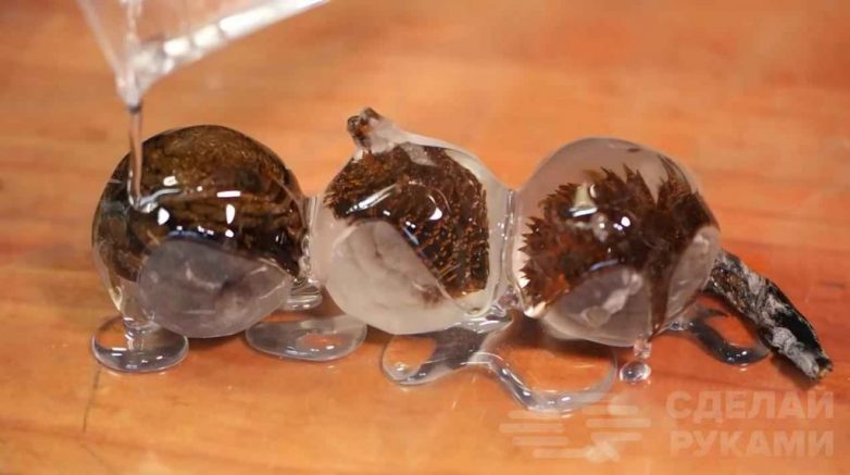 Из маленьких шишек и эпоксидной смолы можно сделать своими руками оригинальный декор для домашнего интерьера — ледяные шарики.