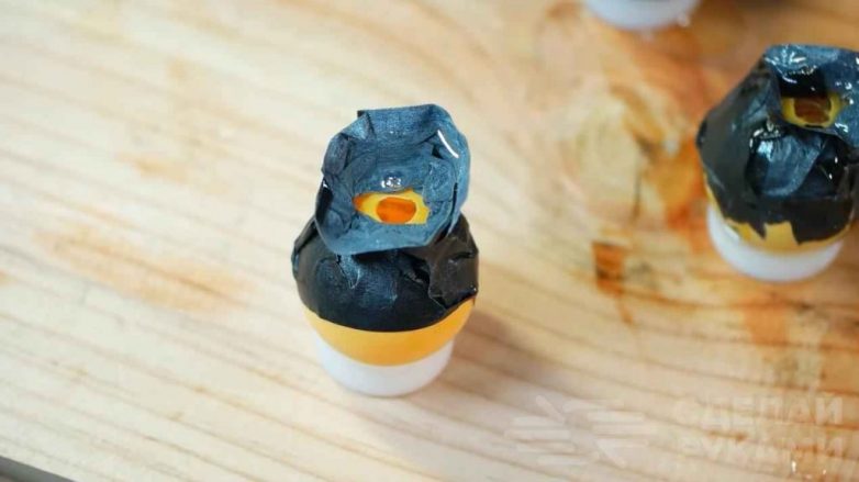 Затем шарики нужно будет обмотать малярным скотчем, и сделать небольшую воронку в верхней части. Каждый шарик для устойчивости необходимо «посадить» на крышку от бутылки. После этого в воронку заливается эпоксидная смола, смешанная с отвердителем.