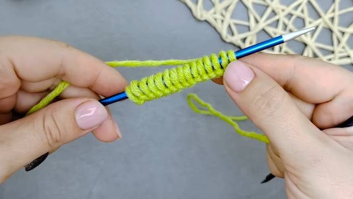 Наберите на спицы нужное кол-во петель. Раппорт узора — всего 1 петля.