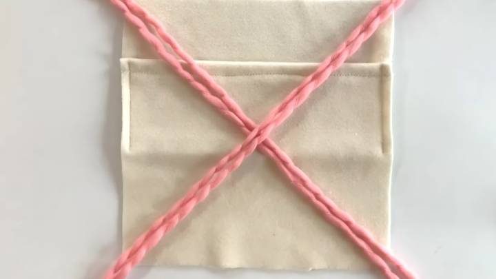 Поверх ткани положите по две нити толстой пряжи крест-накрест. Обратите внимание! Необязательно брать именно 2 нити. Можно плести одной, двумя, тремя и т. д. нитями одновременно. Получится разный результат.