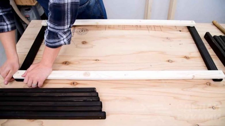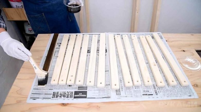 Если нет возможности достать деревянные бруски темного цвета (например, мореный граб, венге и др.), то можно просто воспользоваться краской нужного оттенка. В первую очередь нужно отпилить бруски по размеру. Потом по краям брусков сверлятся сквозные отверстия.