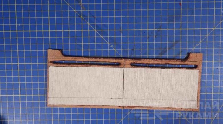 После того, как сделана разметка, при помощи специального ножа для работы с кожей необходимо сделать четыре одинаковых прорези (по две продольных прорези на каждой половинке кожаной заготовки).