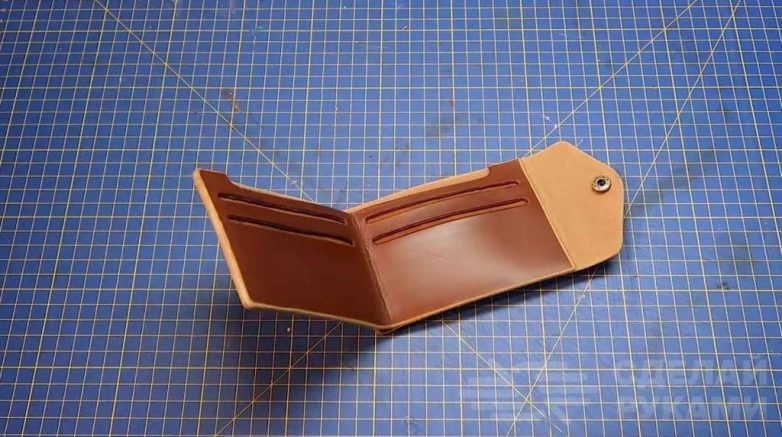 На последнем этапе останется только склеить две кожаные заготовки, а также обработать все торцы и края, чтобы все было ровно. В итоге получился удобный и самое главное — надежный кошелек.
