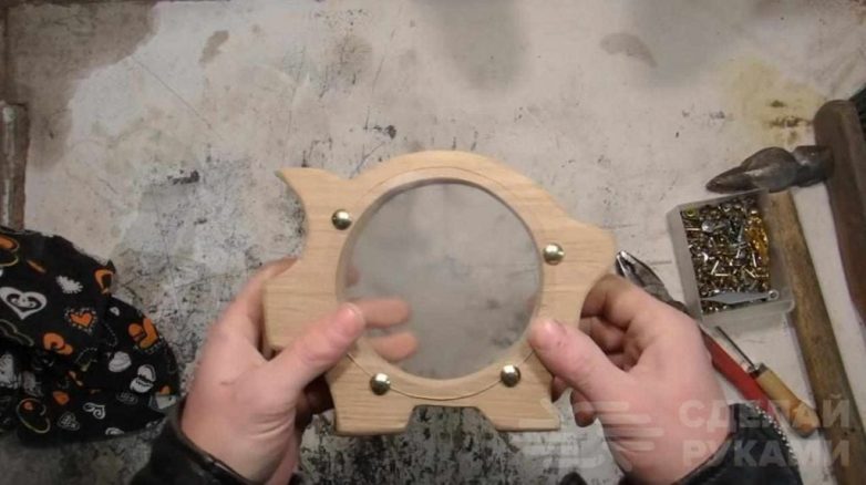 На последнем этапе работ останется только вырезать два круга из оргстекла и «обшить» с двух сторон копилку. В качестве крепежных элементов мастер использует декоративные гвоздики с широкой шляпкой.