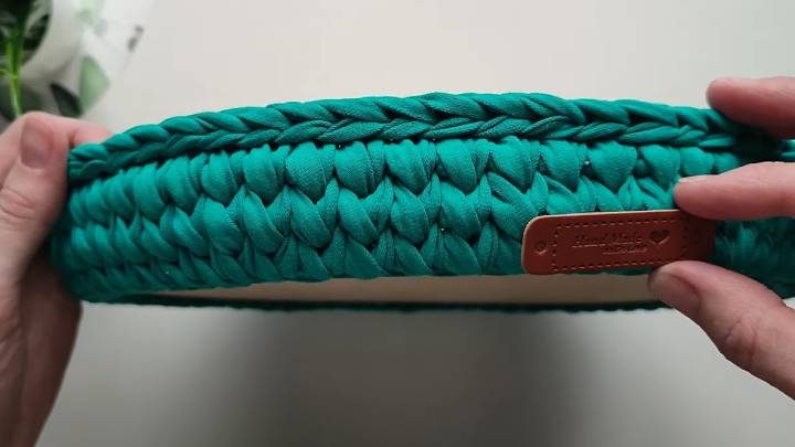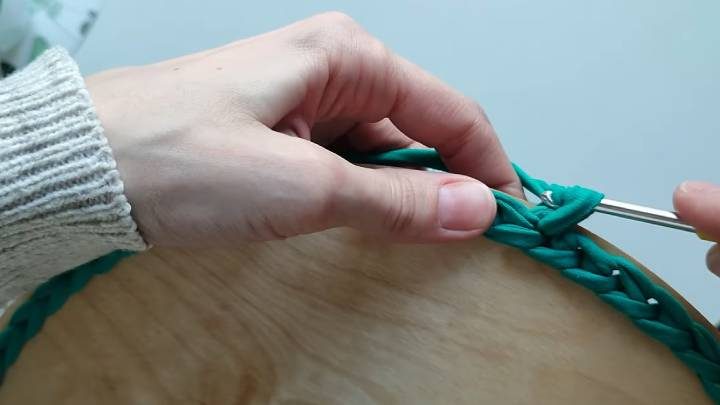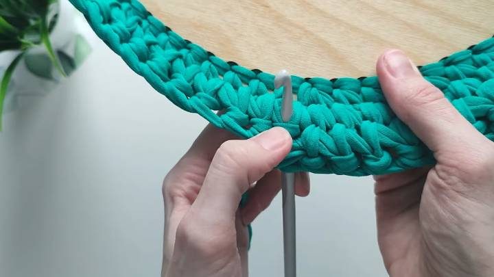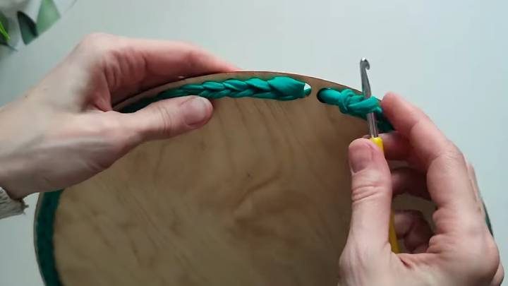 Подготовьте деревянное дно для корзины. Его можно приобрести в магазинах для рукоделия и на онлайн-площадках (Ozon, Wildberries и т. п.). Сначала дно обвязывается соединительными петлями, и только потом вяжутся ряды. В конце каждого ряда обрезайте нить и с помощью кончика соединяйте первую и последнюю петлю.