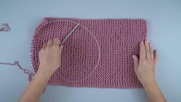 Вязать следует до тех пор, пока длина полотна не составит 45 см (это примерно 95 рядов, в зависимости от плотности пряжи).