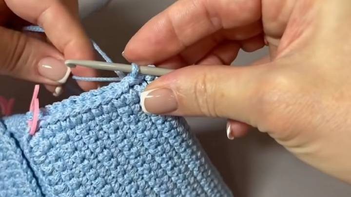 Соединительными столбиками обвяжите боковые стороны. Это можно сделать как крючком, так и иглой с толстым ушком.