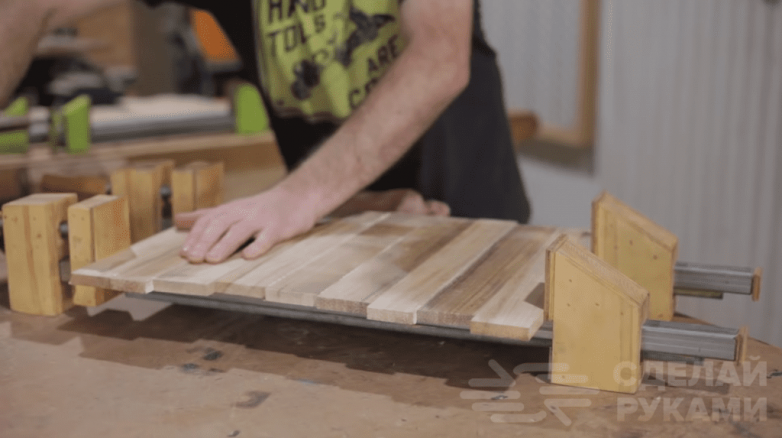 Калиброванные палочки укладываем в специальную форму-шаблон, фиксируем клиньями, а потом смазываем поверхность столярным клеем и приклеиваем по всей длине подложку на тканевой или бумажной основе.