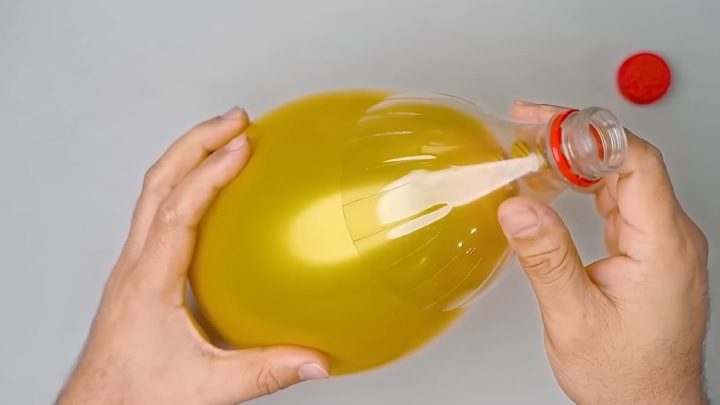 От пластиковой бутылки отрежьте часть с горлышком. Сделайте надрезы по краю. Надуйте воздушный шарик. На малярный скотч закрепите бутылку к шарику.
