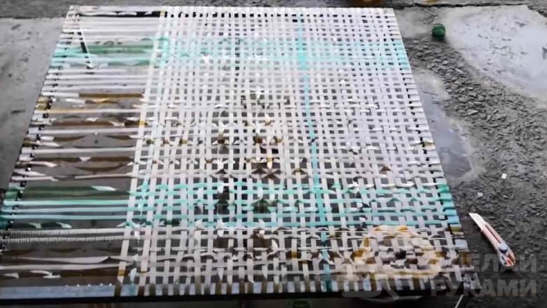 Пластиковые ленты, закрепленные на разных сторонах каркаса (перпендикулярно друг другу), переплетаем между собой. В результате у нас должна получиться сетка.