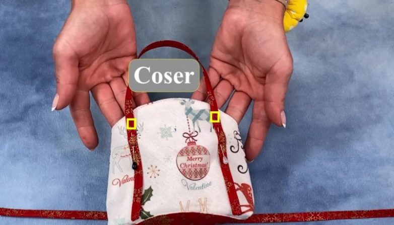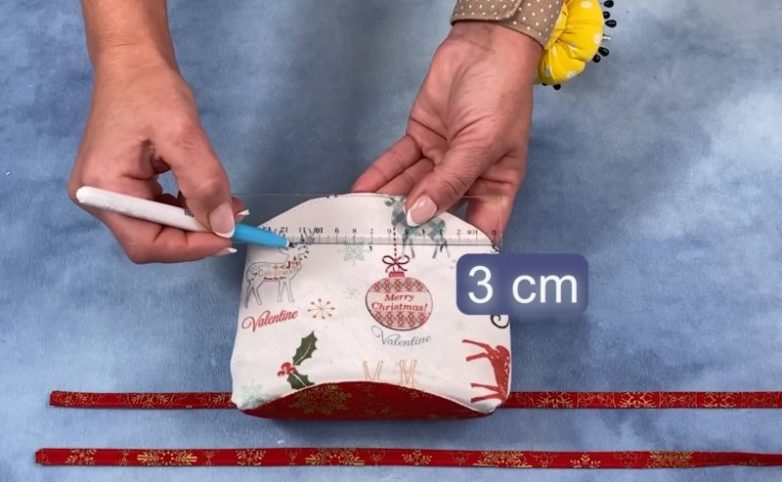 Отметьте середину сумочки и от полученной точки отступите влево и вправо по 3 см. Это будут места пришивания ручек.
