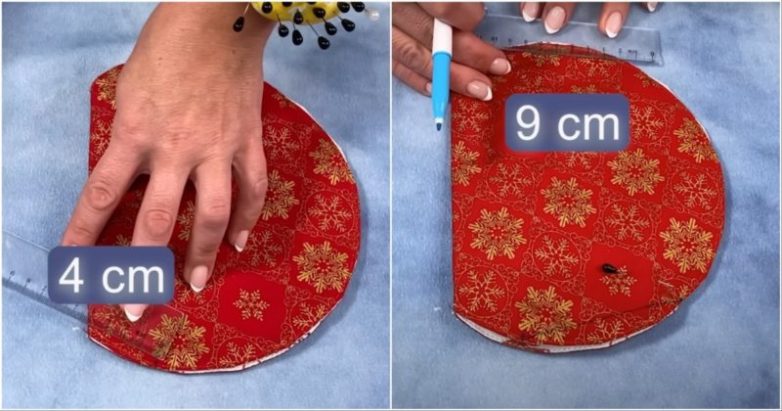 От точки сгиба отложите по окружности сначала 4 см, а затем 9 см.