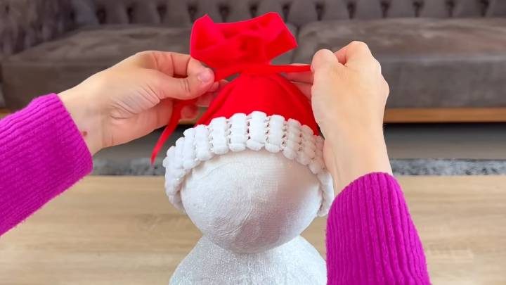 Голову приклейте к туловищу. Украсьте шапкой из ткани.