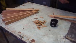 После механической обработки за два подхода склеиваем рейки с «клиньями» — в итоге должно получиться пять пинцетов. Сверлим по два отверстия в месте соединения и забиваем в них мебельные шканты, которые предварительно надо обильно смазать клеем. После высыхания обрезаем все лишнее, шлифуем и делаем насечки на концах щипцов.