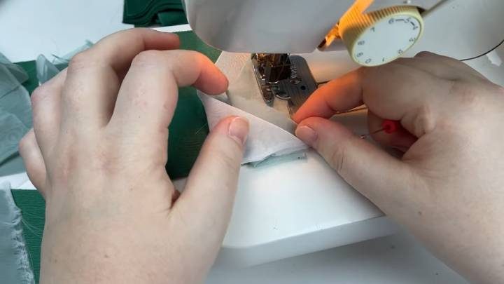 Теперь сверху поместите сложенный пополам, как треугольник, тюль 8 см. Перед тем, как прошить, подверните уголок у тюля меньшего размера, а наверх, внахлёст, подверните уголок у тюля большего размера (см. фото ниже). Одна деталь готова! Для узора нужно подготовить 4 детали.