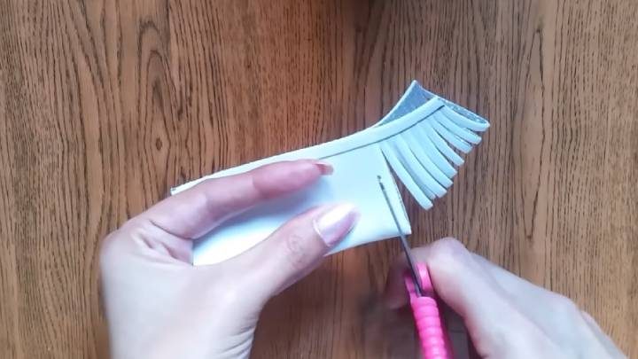 Сложите пополам по длинной стороне. Ножницами прорежьте фоамиран на тонкие полоски ровно до линии.