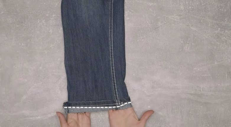 Измерьте ширину зауженной брючины и укоротите кольцо промышленной подгибки.