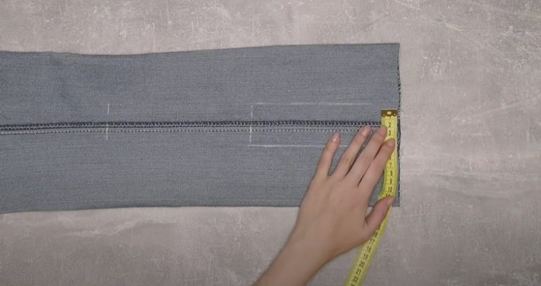 Выверните джинсы на изнаночную сторону и разложите боковым швом вверх. Поставьте по боковому шву две отметки. Одну на расстоянии 17,5 см, вторую на расстоянии 35 см от нижнего среза.