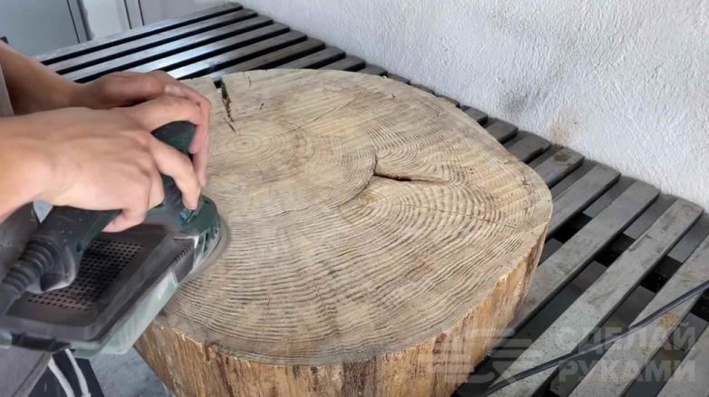 Поверхность спила дерева выравниваем с помощью ручного фрезера и направляющей (такая конструкция условно называется рейсмусовым станком). Затем поверхность надо будет отшлифовать.