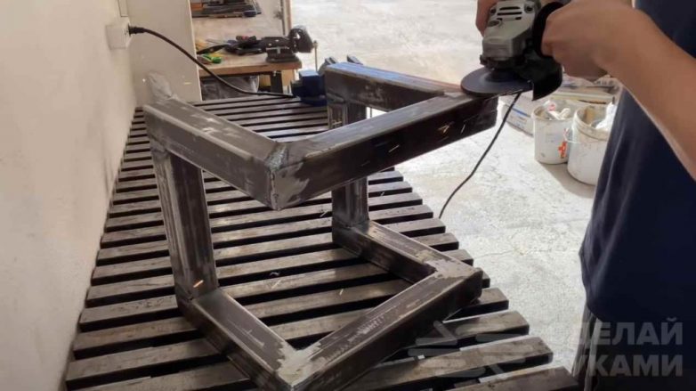 Из отрезков профильной трубы свариваем две ножки П-образной формы. Соединяем их вместе, привариваем два куска профиля в нижней части. Сварные швы зачищаем с помощью лепесткового круга.