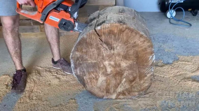 Первым делом нам потребуется спил дерева, который будет выступать в качестве столешницы. Для этого берем подходящий по диаметру пень, делаем разметку, и отпиливаем нужную часть бензопилой.