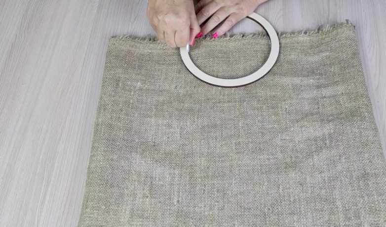 Для изготовления ручки потребуется деревянная заготовка в форме кольца. Диаметр ручки вы можете подобрать по своему усмотрению. Для фиксации ручки заготовьте ещё одну прямую бейку шириной около 4 см и длиной около 40 см.