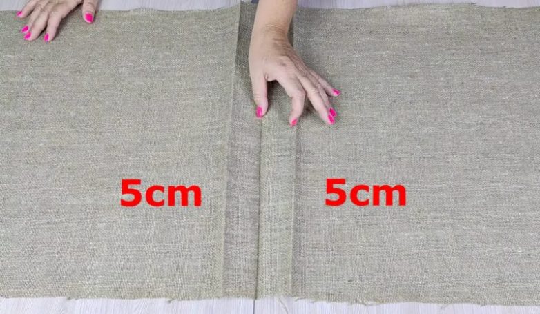 Сложите ткань пополам, проутюжьте сгиб. От сгиба вправо и влево отложите по 5 см. Проведите линии и заутюжьте ткань по этим линиям ещё раз. Заложите складку.