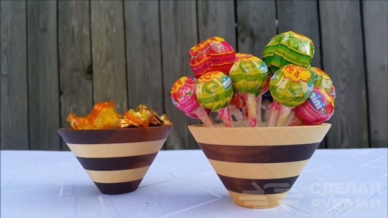 В итоге получились очень симпатичные деревянные вазочки «зебры» для конфет, печенья или фруктов, которые будут оригинально смотреться на любом столе. Подробный процесс изготовления необычных конфетниц из дерева можно посмотреть в видеоролике на сайте.