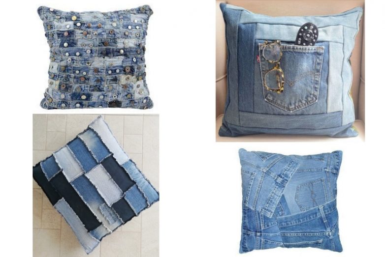 Посмотрите, сколько есть вариантов использования! Из полосок, карманов, с пуговицами и без — самые разнообразные джинсовые подушки.