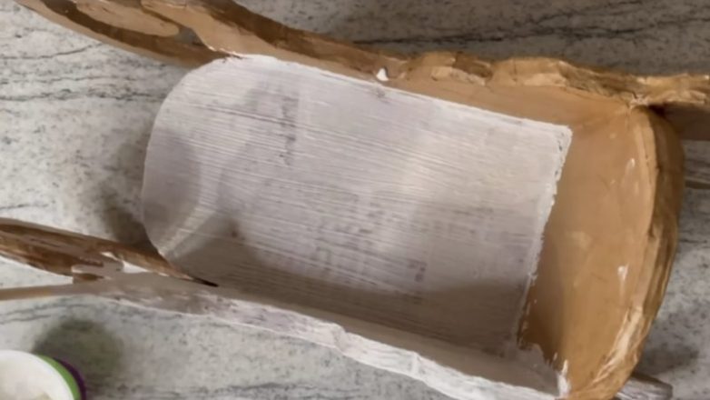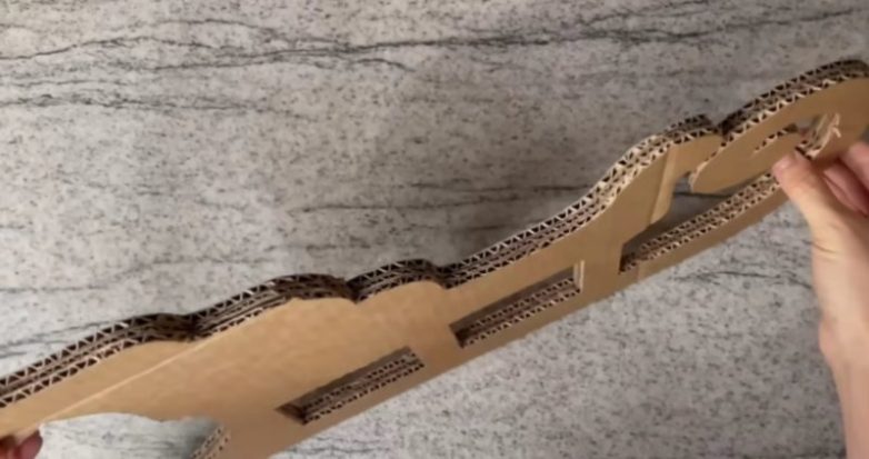 Для выравнивания каркаса понадобится крафтовая бумага. Небольшими кусочками бумаги, обильно смазанными клеем, необходимо обклеить всю поверхность саней, уделяя особое внимание открытым срезам и местам соединения деталей.