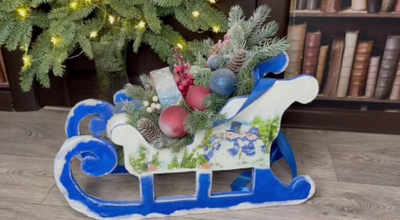 Такой декор выглядит очень эффектно. Сани можно поставить под новогоднюю елку или преподнести в качестве оригинального подарка для близкого человека.