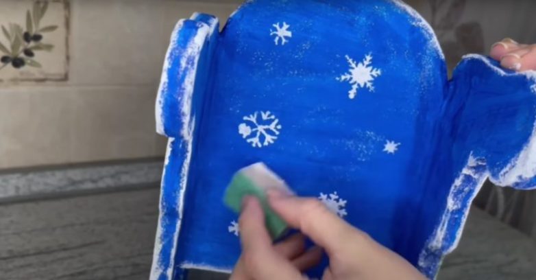 Оформить спинку можно, нарисовав на ней несколько снежинок, самостоятельно, либо с помощью шаблона.