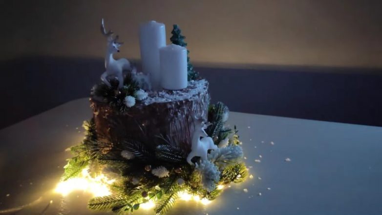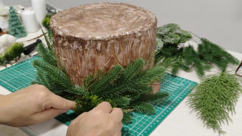 После того как вся краска хорошо просохнет, можно переходить к декорированию пня. Для этого понадобятся еловые веточки, шишки, несколько игрушек, свечи и прочий декор по вашему желанию.