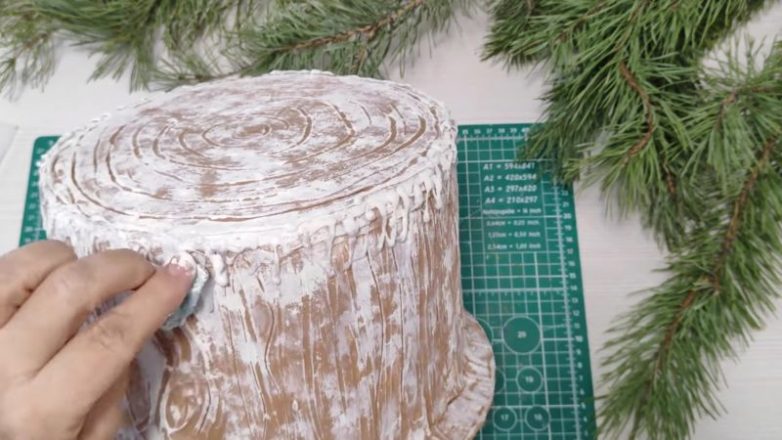 Покрасьте пень бежевыми и коричневыми красками нескольких оттенков. Необходимо сделать пень максимально реалистичным. Чтобы создать эффект того, что пень припорошен снегом, используйте губку и белую акриловую краску.