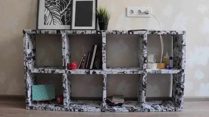 Совет Выберите, чем украсить стеллаж: салфетками в технике декупаж, самоклеящейся плёнкой, остатками обоев или даже распечатанными на принтере картинками.