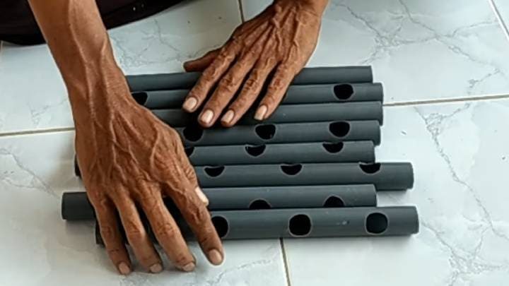 В трубах 19 мм проделайте по 4 отверстия на расстоянии 3 см друг от друга. Понадобится 8 труб длиной 28 см.