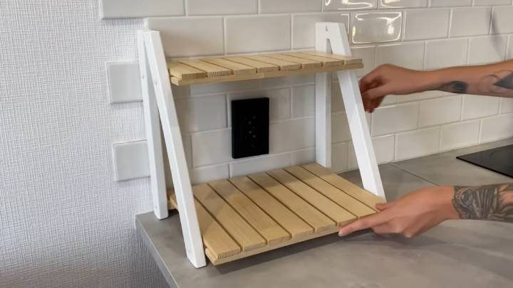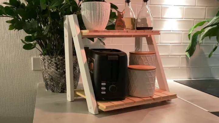 Покрасьте и, по возможности, покройте какой-либо пропиткой для защиты древесины, ведь полка будет стоять на кухне. Можно использовать обычный лак, но также подойдёт масло/воск для дерева.