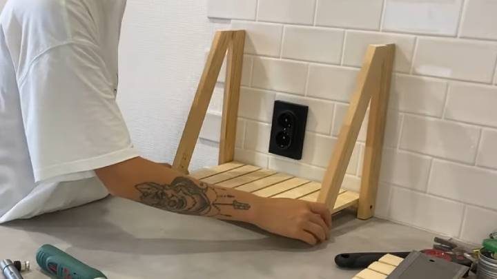 Такая полка великолепно впишется в любой интерьер и чудесно организует пространство кухни! Созданная только из досок, полка не нуждается в фиксации на стене: она стоит на столешнице и украшает собой пространство. Минимальный бюджет, но шикарный результат!