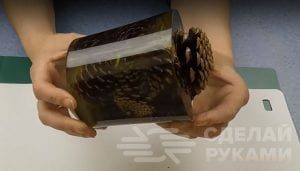 Пластиковую емкость подходящих размеров смазываем изнутри вазелином, чтобы эпоксидка не прилипла к стенкам., и засыпаем внутрь сосновые шишки. Верхнюю шишку фиксируем при помощи скотча, чтобы она не всплывала. Затем заливаем «начинку» эпоксидной смолой.