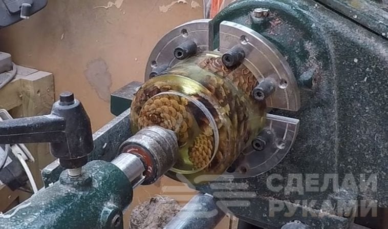 После полного застывания эпоксидки вынимаем заготовку из формы и обрабатываем потом на токарном станке. Нужно сделать крышку, а также отверстие внутри шкатулки. Поверхность изделия шлифуется и полируется. Подробный процесс изготовления декоративной шкатулки из эпоксидки и сосновых шишек смотрите в видеоролике.