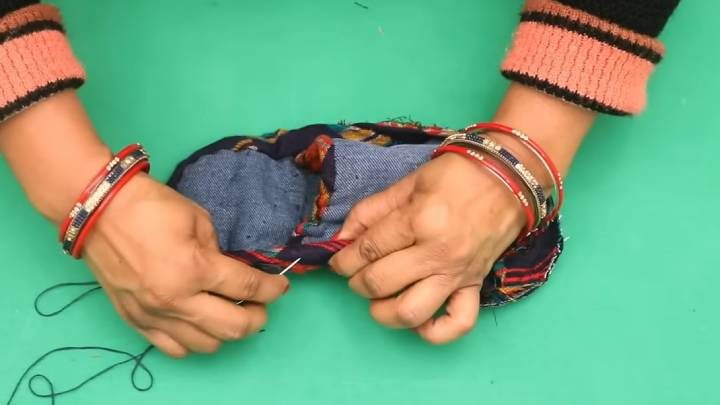 Сложите детали тапочек «бутербродом», где низ и верх — джинсовая ткань, а середина — свитер. Сколите их булавками. Для удобства расчертите мелом косые линии на равном расстоянии друг от друга. Прошейте по линиям вручную. Можно подобрать нитки в тон джинсам, чтобы их почти не было видно.