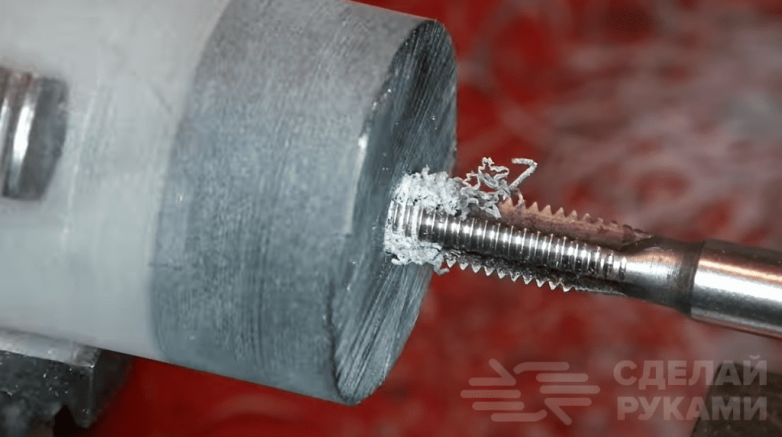 После застывания снимаем пленку. Закрепляем пробку в станок и снимаем верхний слой, доводя пробку до необходимых размеров. Потом отпиливаем обычную пробку от застывшей смолы. Закрепляем заготовку в станке, отмечаем центр, просверливаем отверстие и нарезаем резьбу.