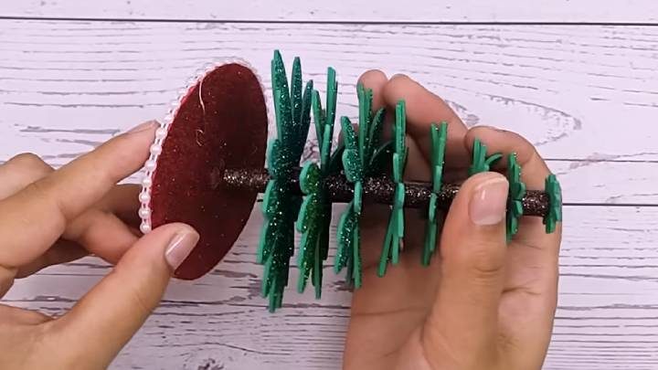 Сборка мини-ёлочкиКоричневый фоамиран нарежьте на полосы 5*1 см. Скрутите и склейте. Сделайте 9 шт.