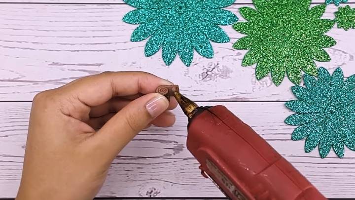 Для одной ёлочки соберите 8 таких деталей разных диаметров (от 8 см до 1 см). Можно комбинировать сразу два цвета: зелёный и бирюзовый, например.