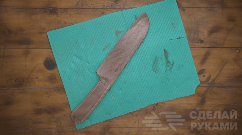 Далее шлифуем заготовку и делаем заточку. Подробно о том, как сделать деревянный нож из шпона по японской технологии, можно посмотреть в видеоролике на сайте.