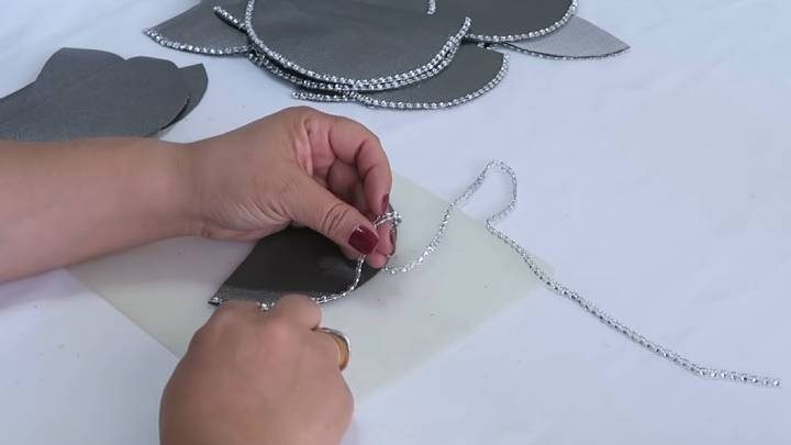 Клеевым пистолетом закрепите отрезанную полоску ленты с имитацией страз. Крепите её только на закруглённую часть половинки.